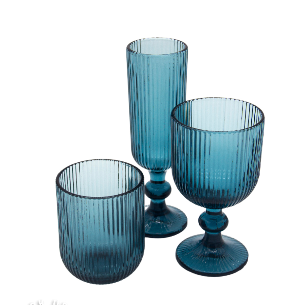 Copa Brocado Azul con diseño estriado y tono vibrante. Su elegancia y versatilidad la hacen ideal para bodas y eventos exclusivos.