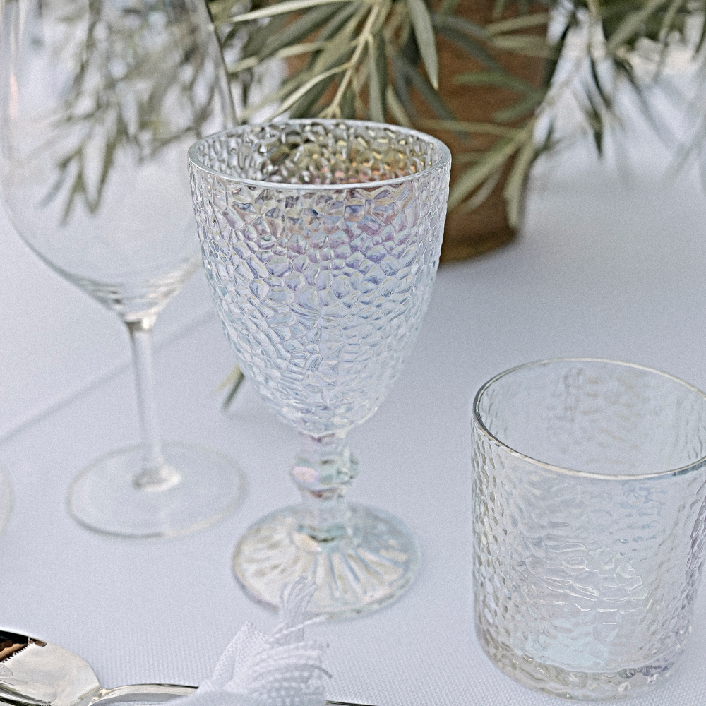 La copa brocada Piedra de Luna es una pieza única y especial. Su elegante tono blanco, combinado con reflejos brillantes en tonos lila, crea un efecto mágico y sofisticado en la mesa. Su diseño brocado en relieve realza su belleza, aportando un aire distinguido y elegante. En nuestra empresa nos enorgullece ofrecerte solo lo mejor en cuanto a calidad y servicio. Por eso, nuestras copas Piedra de Luna son de la más alta calidad y están en excelentes condiciones para el uso en tus eventos. Es altamente resistente a los golpes, lo que la convierte en una opción ideal para eventos exclusivos, bodas y celebraciones donde la estética y la durabilidad van de la mano.