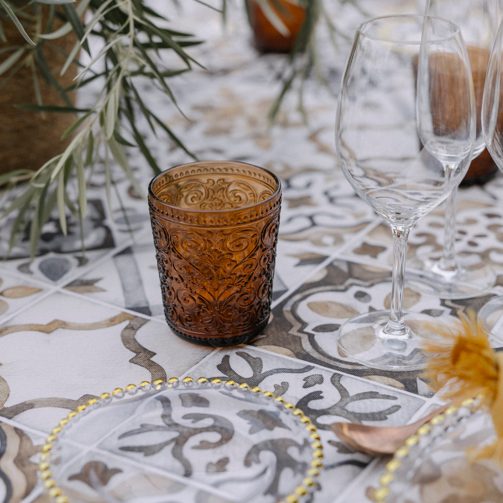 El vaso Natura Ámbar es una pieza que destaca por su presencia imponente y su diseño sofisticado. Su color ámbar es intenso y vibrante, aportando calidez y elegancia a la mesa. Los motivos vegetales en relieve, con un estilo barroco, le confieren un aire majestuoso y detallado, ideal para quienes buscan una estética refinada y con carácter. Su estructura resistente lo hace perfecto para eventos exclusivos, bodas y celebraciones con un toque distinguido y nostálgico.